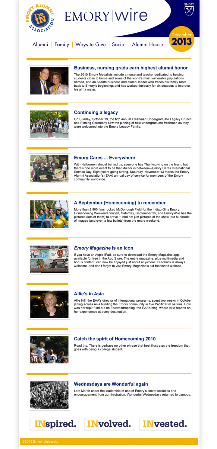 EmoryWire Digital Magazine started as a recurring mass email, and eventually evolved into its own microsite telling the most compelling stories of Emory alumni, researchers, and staff. These graphics comprise a 2018 series of promotional designs, a set of social media feed images for the top ten stories of 2017, and the desktop display of my 2013 redesign of the email as a full realization of the Emory Alumni Association "I'm IN" sub-brand.
